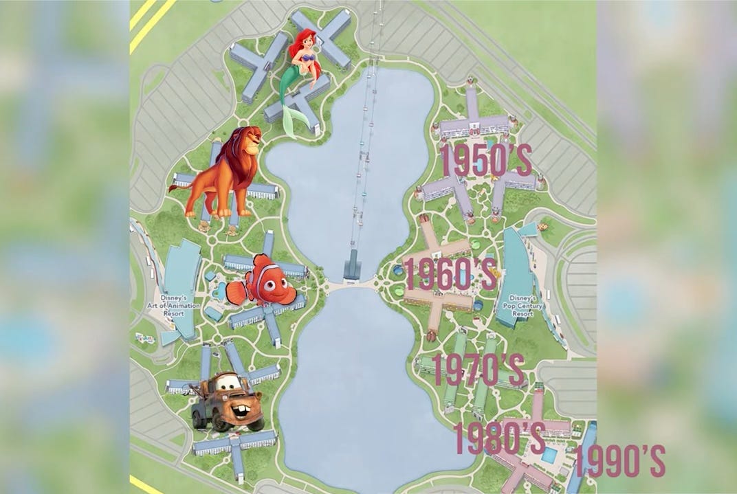Branching off those main buildings are the blocks of guest rooms, each section themed around a Disney film at Art of Animation or a specific decade at Pop Century. Art of Animation's sections are The Little Mermaid, the Lion King, Finding Nemo, and Cars. At Pop Century, the sections are the 1950s, 1960s, 1970s, 1980s, and 1990s.